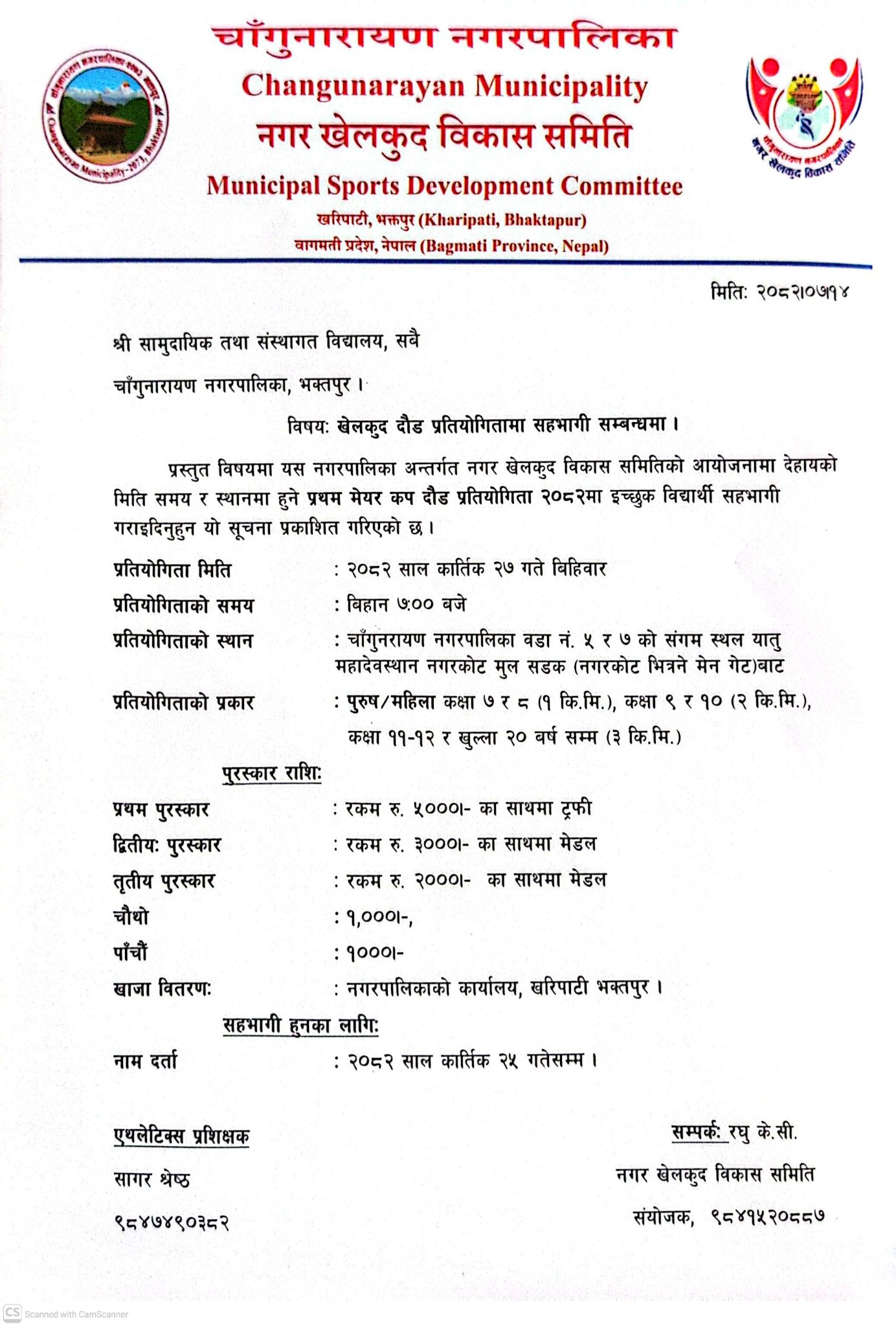नगर खेलकुद समितिले प्रतियोगितामा सहभागि हुन चाहनेका लागि कार्तिक २५ गतेसम्म नगरपालिकाको कार्यालय खरिपाटीमा सम्पर्क गरि नाम दर्ता गराउन आव्हान गरेको संयोजक केसीले जानकारी दिनुभयो ।