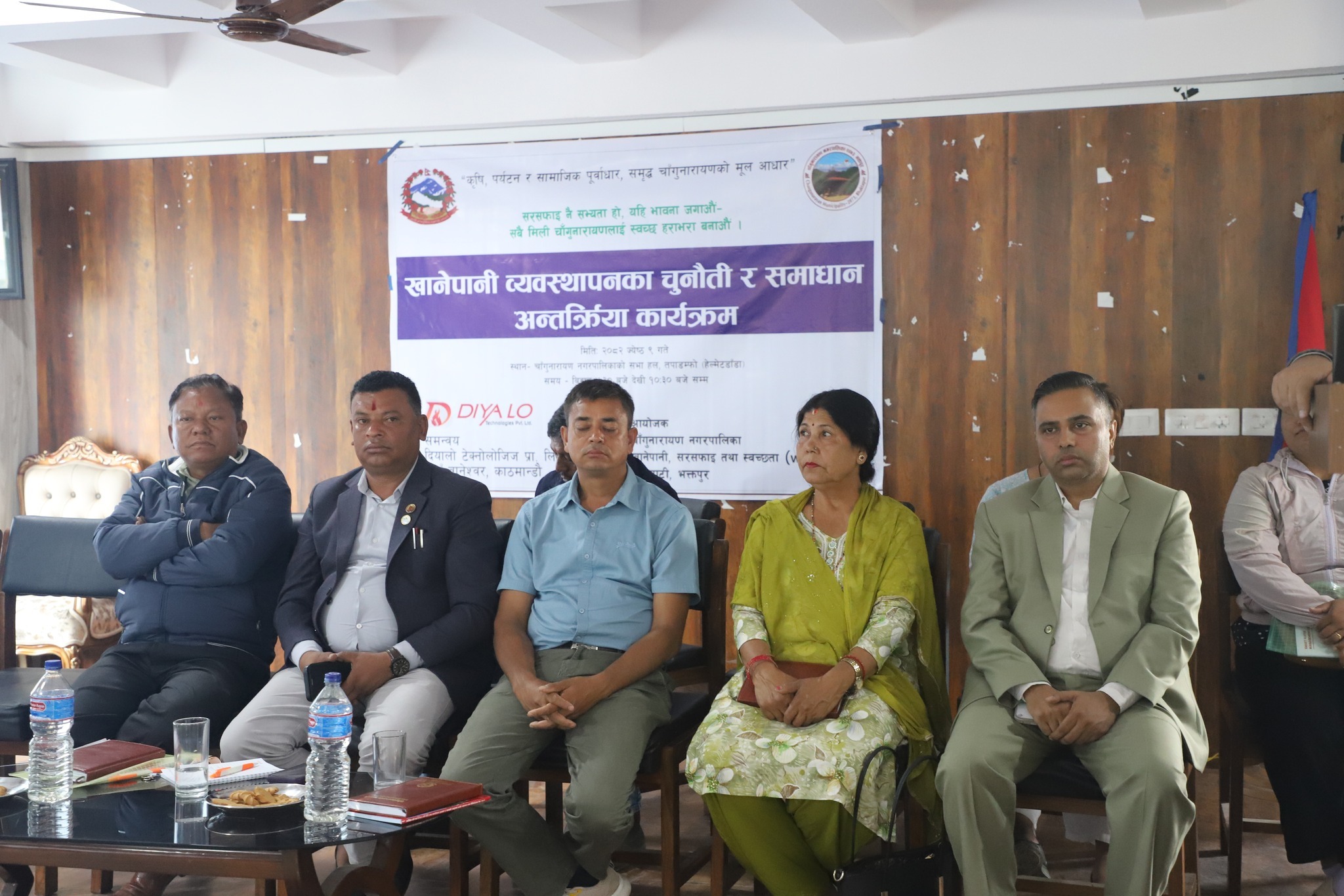 चाँगुनारायण नगरपालिकाको खानेपानी, सरसफाई तथा स्वच्छता शाखाको आयोजना र दियालो टेकनोलोजीको समन्वयमा शुक्रबार भएको ‘खानेपानी व्यवस्थापनका चुनौती र समाधान’ विषयक अन्तरक्रिर्या कार्यक्रममा बोल्दै उहाँले यस्तो बताउनु भएको हो । उहाँले चाँगुनारायण नगरपालिका क्षेत्र भित्र ७८ वटा मूलको र ५० वटा डिप बोरिङबाट खानेपानी वितरण भइरहेको बताउदै घरघरमा खानेपानी पुर्याउन नगरपालिका लागिरहेको बताउनुभयो ।