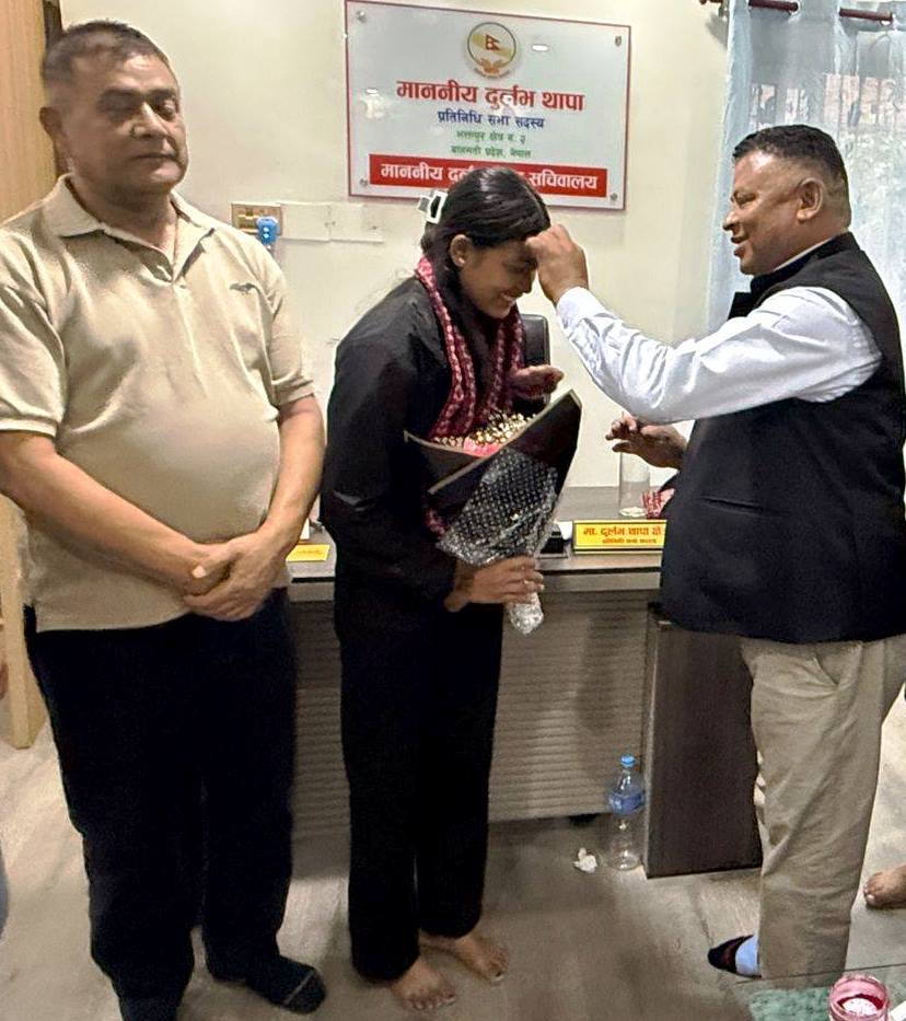आफ्ना नागरिकको खुसीमा मात्रै होइन दुःखमा पनि साथ दिने पुगिहाल्ने नगर प्रमुख खत्रीले गोमाको भविश्यको बाटोको पहिलो खुटकिलो पार लगाउन जुन मद्दत गरेर सरकारको अनुभूति दिलाउनु भयो । त्यस लगत्तै काँग्रेस सभापति एवं सांसद थापाले मिनालाई आफ्नै घरको सचीवालयको कक्षमा टीका र खादा ओढाएर बधाई मात्रै दिनु भएन नासा कलेजमा निःशुल्क पढ्ने गरि छात्रबृत्ति दिने घोषणा गर्नुभयो । नगर प्रमुख खत्रीले पनि त्यही खादा ओढाएर टीका लगाईदिएर गोमालाई थप प्रेरणा र हौसला प्रदान गर्नु भयो ।