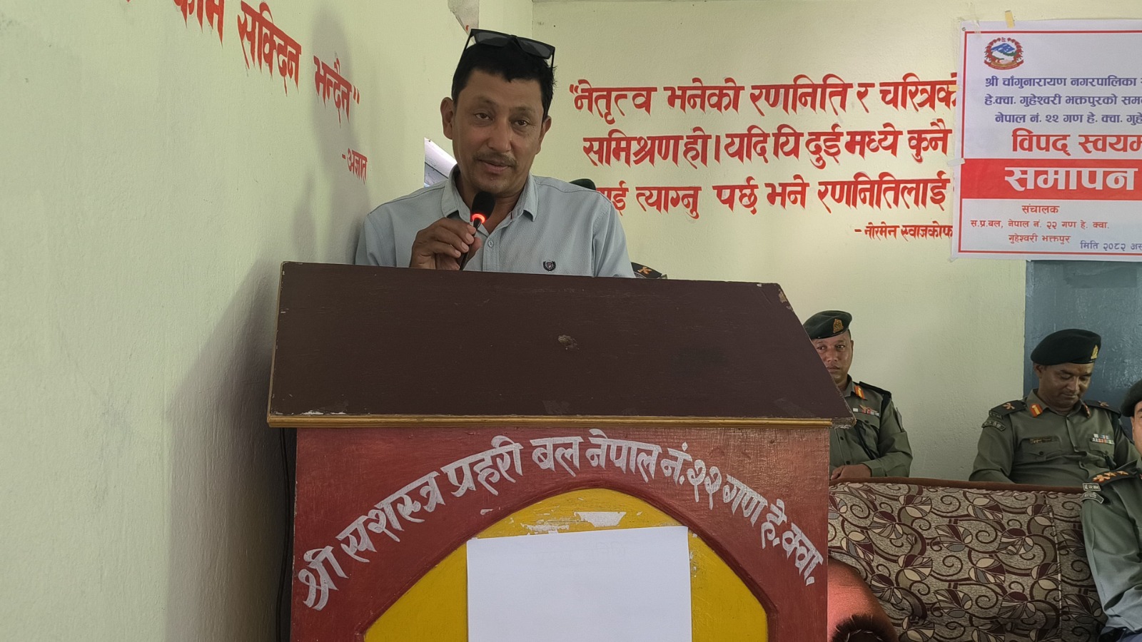 सशस्त्र प्रहरी बल दुवाकोट गणका गणपति जनक सापकोटाले स्थानीय तह र सुरक्षा निकाय बीचको सहकार्य र समन्वयले सम्भावित विपद्को जोखिम न्यूनीकरण र प्रतिकार्य गर्न सकिने बताउनुभयो । विपद् व्यवस्थापन तीनै तहको सरकारको जिम्मेवारी भित्र पर्ने काम भएकाले र सबै पक्षको आपसी सहयोग विना विपद् व्यवस्थापन गर्न गाह्रो पर्ने बताउनुभयो । सशस्त्र प्रहरी बलले चाँगुनारायण नगरपालिकासंग आवश्यक समन्वय र सहकार्य गर्दै आएको बताउनुहुदै स्वयंसेवकहरुलाई प्रशिक्षणको लागि नगरपालिकाल्े सशस्त्र प्रहरी बललाई जिम्मेवारी प्रदान गर्नुभएकोमा नगरपालिका प्रति कृतज्ञता ब्यक्त गर्नुभयो । उहाँले नगरपालिकासंगको सहकार्य र समन्वय आगामी दिनमा पनि निरन्तरता पाउने कुरामा विश्वास व्यक्त गर्नुभयो ।