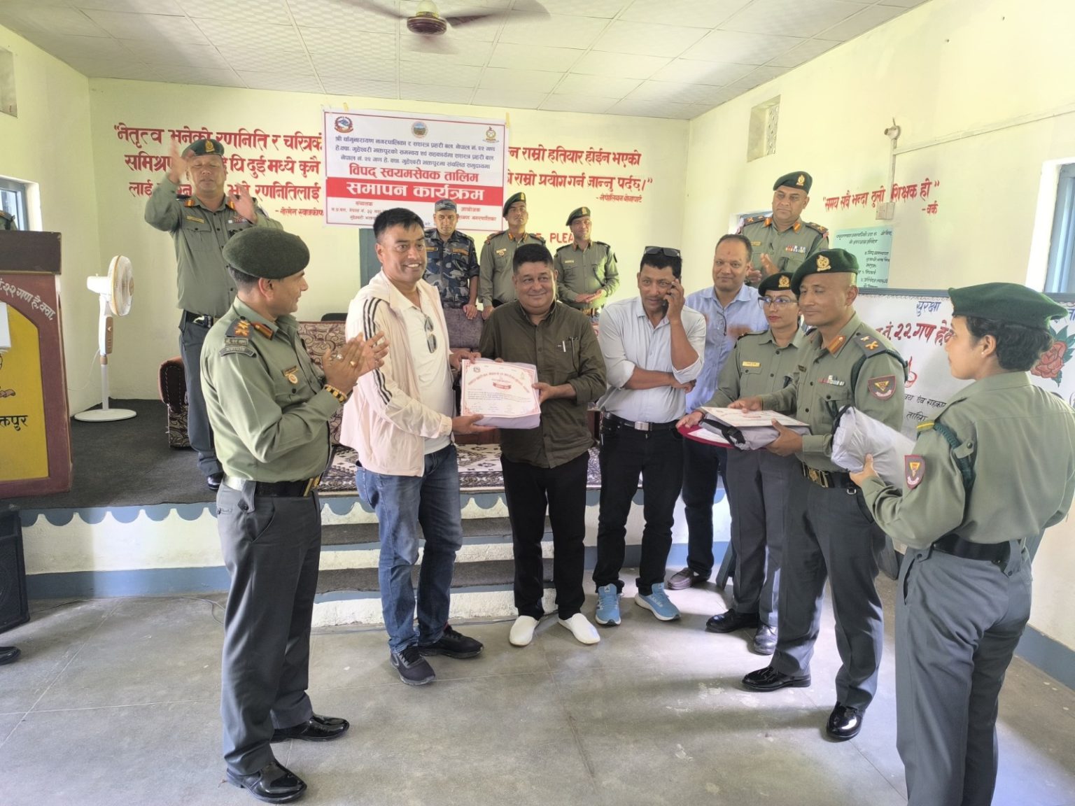 भक्तपुर, २५ असार । चाँगुनारायण नगरपालिकाको सहयोग, समन्वय र सहकार्यमा सशस्त्र प्रहरी बल नेपाल नं २२ गण हे.क्वा गुह्येश्वरी भक्तपुरद्वारा सञ्चालित विपद् स्वयंसेवक (अग्रवर्ती खोज तथा उद्धार ) प्रशिक्षण सम्पन्न भएकोछ । नगर प्रहरी तथा विपद् व्यवस्थापन स्वयंसेवकहरुको लागि असार २ गते बाट सशस्त्र प्रहरीबलको दुवाकोट गणमा सञ्चालित प्रशिक्षणमा १० महिला र २२ पुरुष गरी ३२ जनाको सहभागिता रहेको थियो ।